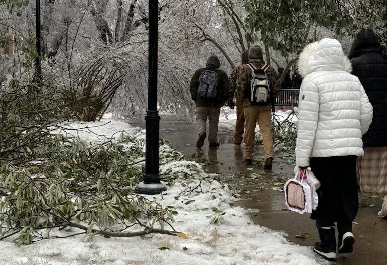 The winter storm projected for January 2026 hit Lipscomb’s campus in a far different manner than expected. Though the forecast had called for up to 15 inches of snow, the campus saw only two to three inches. The ice that followed, however, would cause a problem. Clinging to all of the trees and power lines both on campus and around Nashville, the ice wreaked havoc. Tree limbs came crashing down all across campus with crashing thuds and rending cracks. Some smaller trees were even fully uprooted by the weight of the ice. Students were advised to avoid walking underneath trees whenever possible and to stay alert when crossing beneath one. Several of the trees exploded, with booms akin to a cannon being fired. The weight of the ice also yanked down power lines across the city. Lipscomb’s power went out around 11 a.m. Sunday, plunging every building on campus into darkness. Students gathered in the Bennett Campus Center – “the Stu,” to students – as soft alarms rang out through the dark building. The Stu’s permanent generator kicked on within the hour, garnering cheers from the students packed into the cafeteria upstairs and studying area downstairs. The cafeteria and Stu remained packed the entire rest of the day, students filling every chair and sofa in the building. Every power outlet was taken advantage of, many with power strips plugged in, as students charged their electronics. Personal televisions were also brought into the Stu and students put on the AFC football championship game and the Stanley Cup playoffs, cheers – and groans – filling the area known as Zebbie’s Lounge. Some students also brought their own PCs and played video games. Toward the evening, students received word that power would not be returned to campus; therefore, heat would not be working in their dorms. They were encouraged to shelter and sleep in other buildings: women from Fanning, Johnson and Elam in Bennett; women from The Bison and The Village in the nursing building; and men from High Rise and The Village in either Shamblin Theater or Sewell Hall. Sewell, Bennett and the nursing building were the only available options on campus with generators running. Students made the most of their powerless day, playing cards in circles on the floor of the Stu, or tackle football in the Quad beside Beaman Library. Groups of students sat together crocheting, weaving friendship bracelets, knitting and painting. Some started a spontaneous worship night in Shamblin, over a hundred students gathering and sitting on the stage to sing together. Some students chose to remain in their dorms for the night, despite the lack of heat, others chose to camp out in the buildings with generators. One girl even set up a tent in the middle of the Stu, and many of the athletes brought air mattresses and set up camp in Allen. The ice is expected to remain in the area for several days, as temperatures continue to hover below freezing. As of 1:30 p.m. on Monday, Lipscomb University is still without power. Featured image taken by Micah Barkley.
