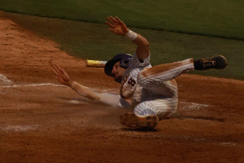 Featured image of senior infielder Damion Kenealy Jr. sliding safely home taken by Micah Barkley.
