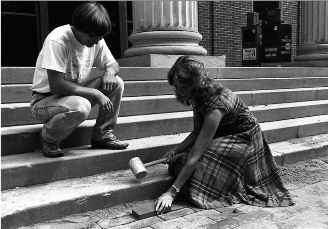 On any given day, the sound of footsteps and laughter echoes across the brick of Bison Square — the same place where generations of students have met for dinner, studied between classes, or lingered long after sunset. Decades ago, though, the heart of campus was nothing more than a muddy shortcut worn down by thousands of shoes. The student-built Bison Square — now considered the heart of Lipscomb’s social life — has celebrated its 45th anniversary this year. President Willard Collins smiles for a photo when Bison Square was completed (1981). The area exists thanks to the Lipscomb students of the 1970s and 1980s who helped make the square a…