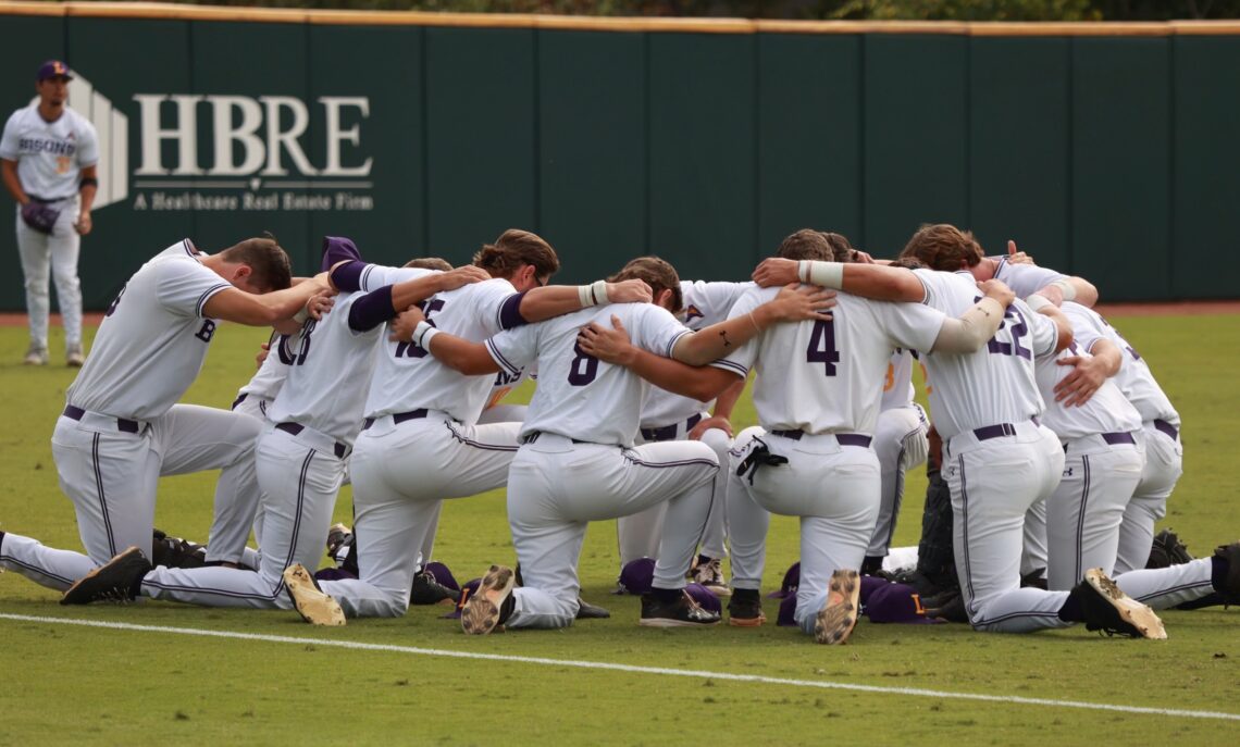 Featured image of members of the baseball team kneeling for prayer before a game taken by Micah Barkley.