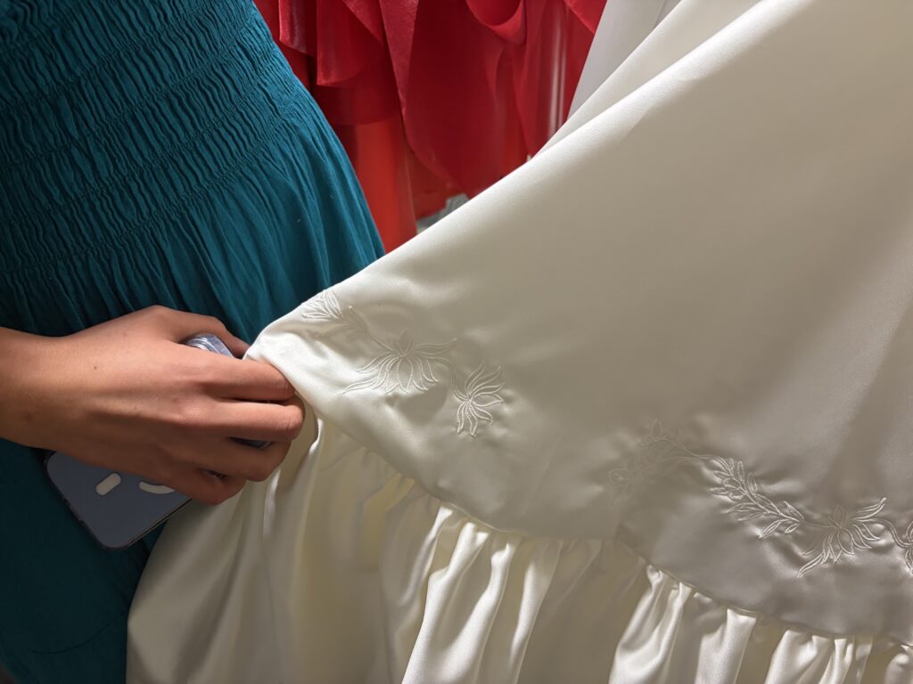 Romano’s pieces incorporated complex embroidery and hand-stitched pearls. She said the process of preparing for the fashion show is long – the seniors began working on their designs in August.