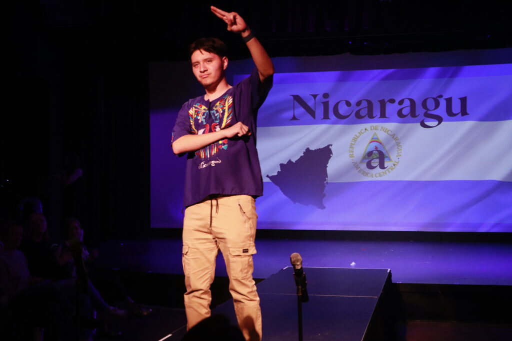 Somalia was up next, then Nicaragua. Sophomore Harold Espinoza Lopez walked for Nicaragua, his blue traditional shirt colorfully embroidered with birds and other cultural designs.
