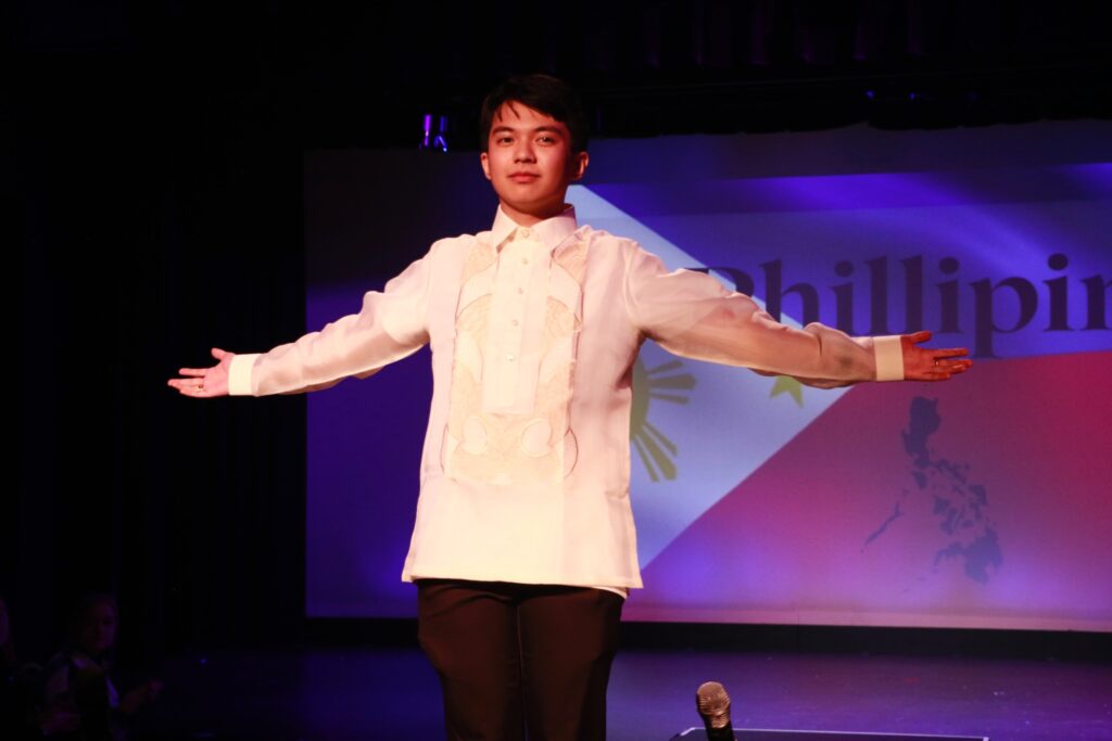 The Philippines was the largest group, 11 people walking in cultural clothing. After all 11 walked, Marielle Guarin and Mychaela James came out to sing a traditional song, and then the entire group flooded the stage to perform a traditional dance. The rhythmic sounds of dancing feet and poles tapping on the ground filled Shamblin as the group jumped and danced around and over sets of poles on the floor.